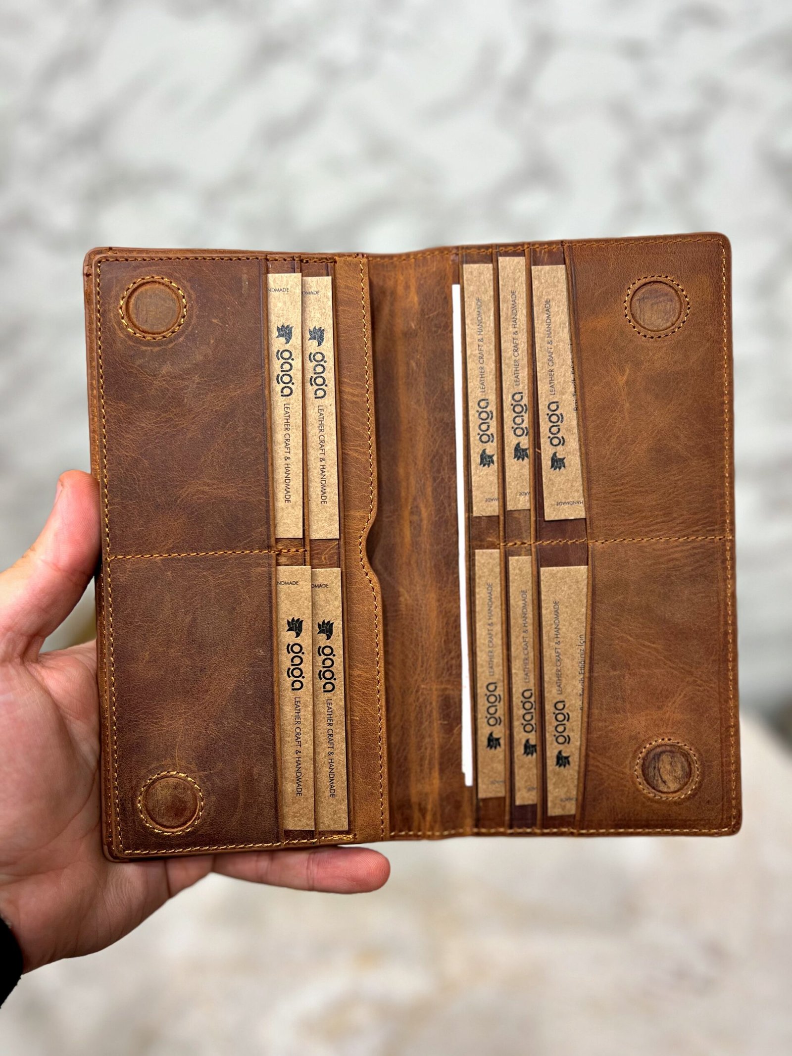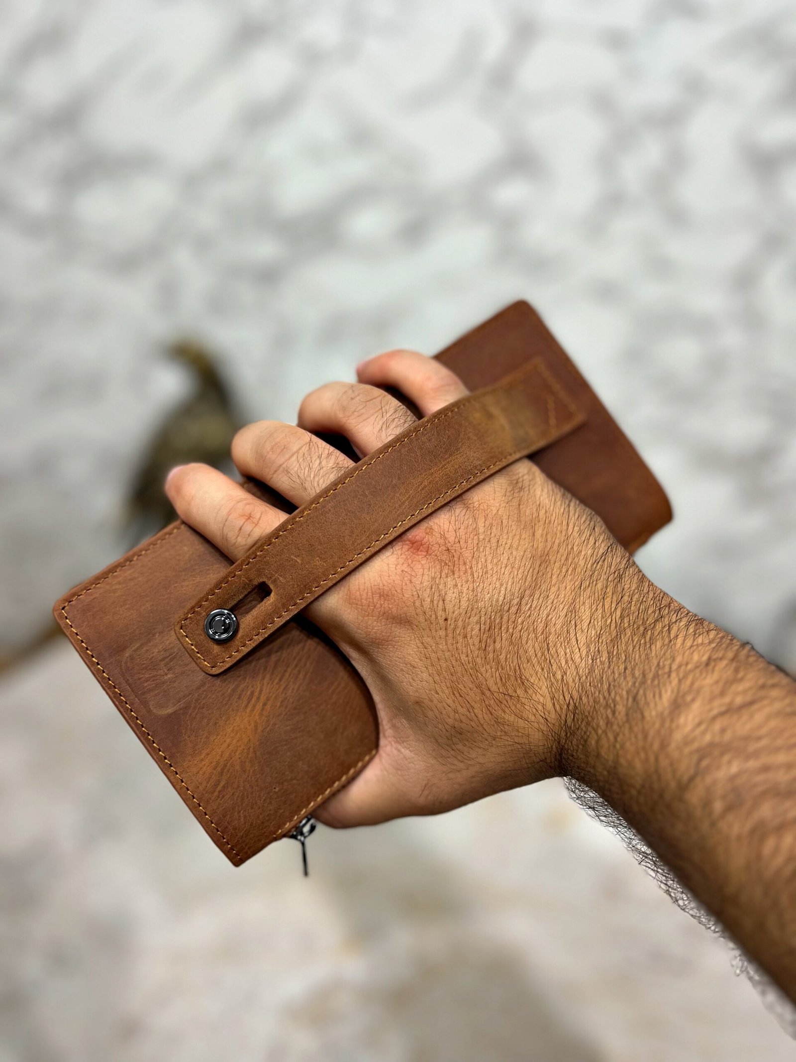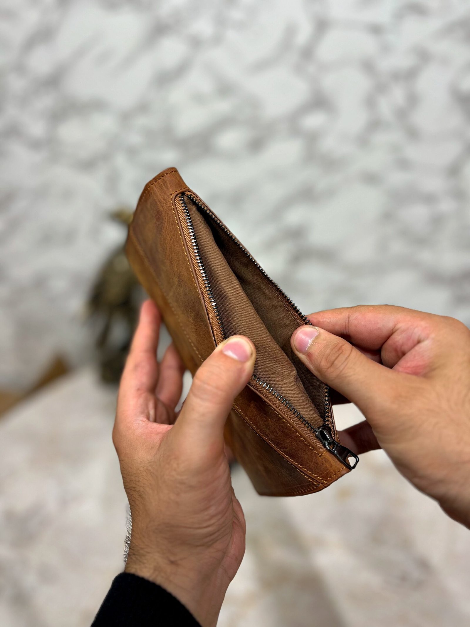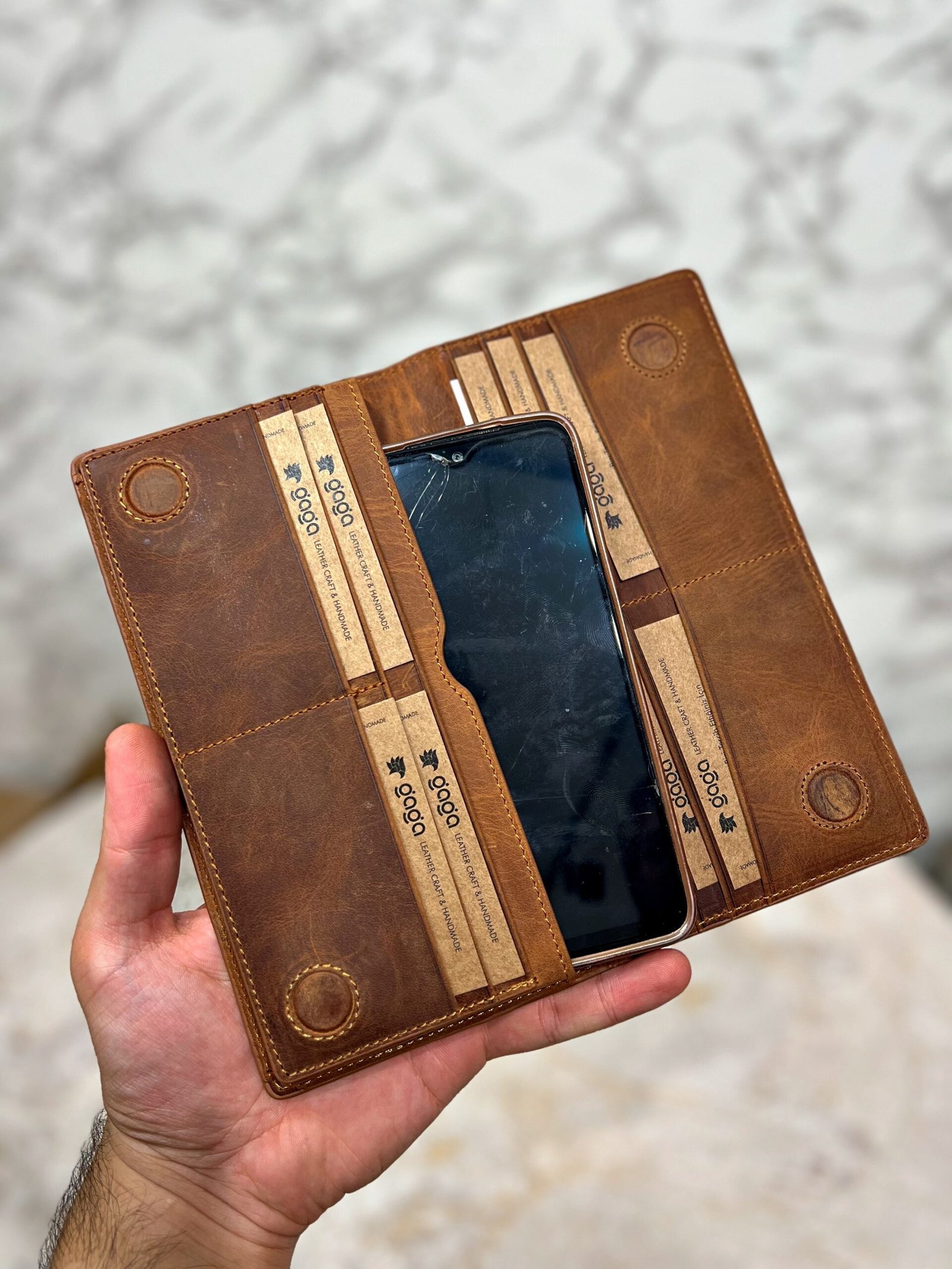 El Tutamaçlı Hakiki Deri Telefon Bölmeli Parçalı Cüzdan Fındık